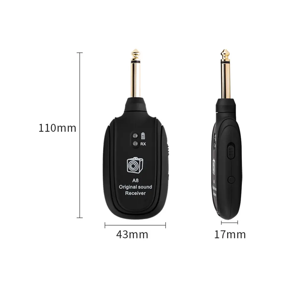 The A8 UHF Wireless Guitar System offers high-quality, reliable performance for guitar and bass players. With a 50-meter range, UHF technology ensures clear, stable audio transmission with minimal latency, allowing musicians to move freely while performing.