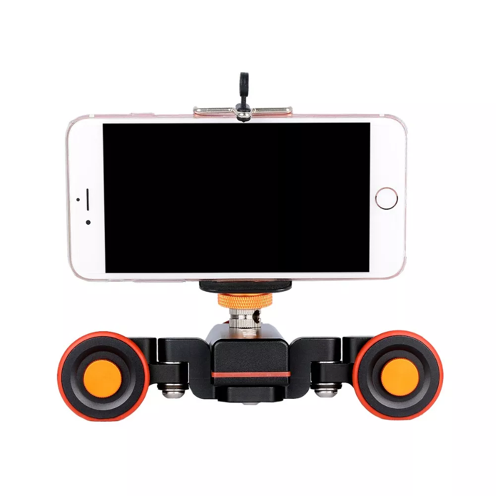 The L4X Motorized DSLR Dolly from YELANGU, in black with orange accents, runs on a flat surface and can make straight, curved, or 360° circular moves. This dolly is designed to work with DSLR and mirrorless cameras weighing up to 6.6 pounds. It includes a reversible 1/4″-20 to 3/8″-16 threaded stud mount for your camera or ball head, and can support smartphones with a separately available Smartphone clamp. Dolly features include three selectable speeds, direct control, and an included remote control with a range of up to 19′.